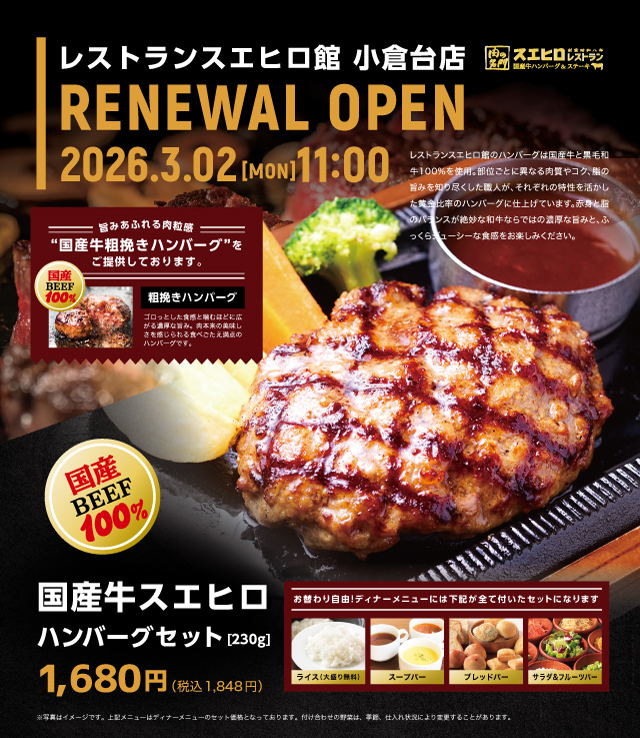 レストランスエヒロ館 小倉台店は2026年3月2日(月)にリニューアルオープンいたします。
